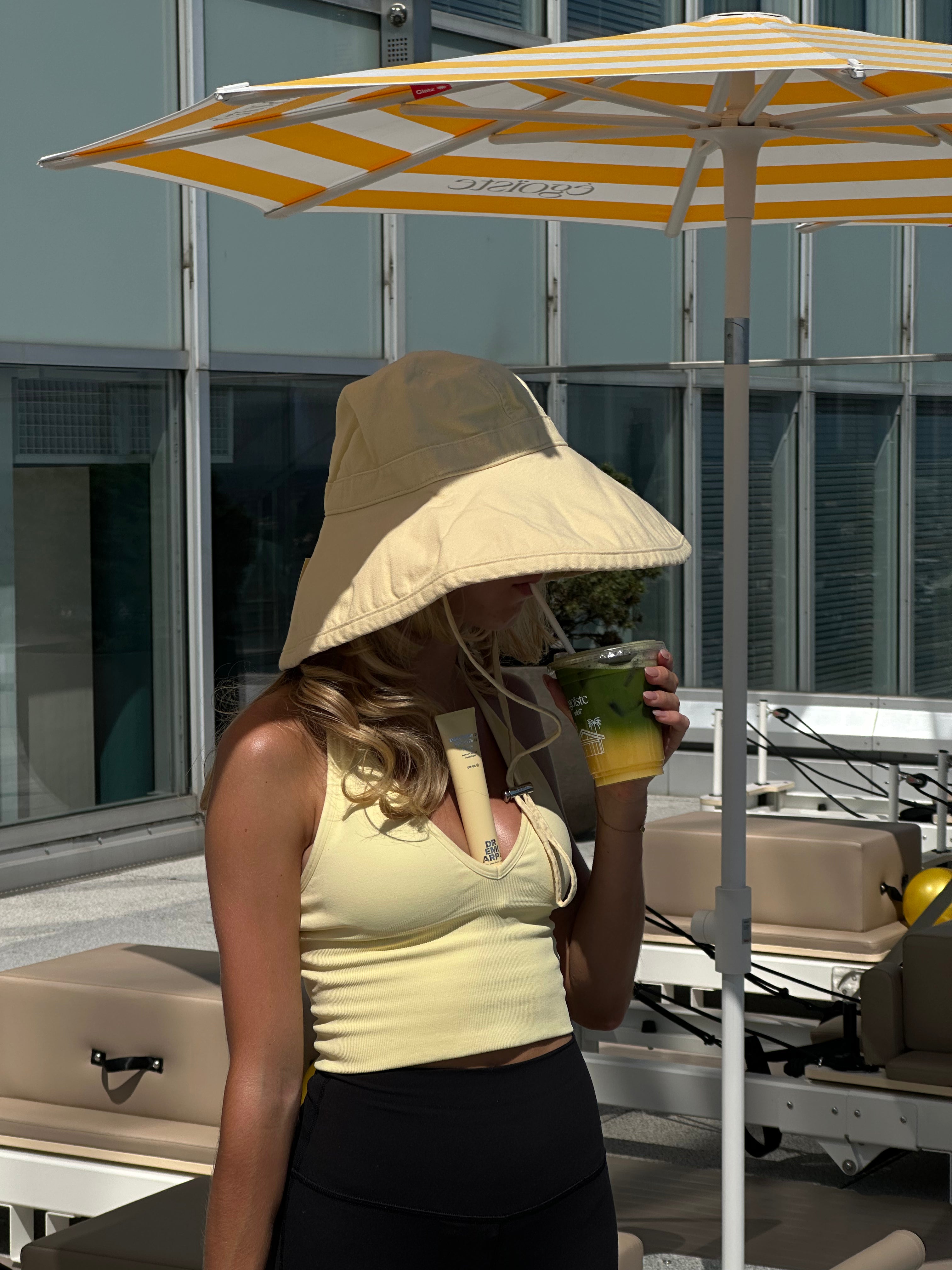 Defence begins before exposure: Der limitierte Canvas Summer Hat in Butter Yellow entstand in exklusiver Zusammenarbeit mit dem Berliner Label 032c. Lässig & leicht, mit UV-sensitivem DEFENCE-Print, dezenter Stickerei und verstellbarem Band.